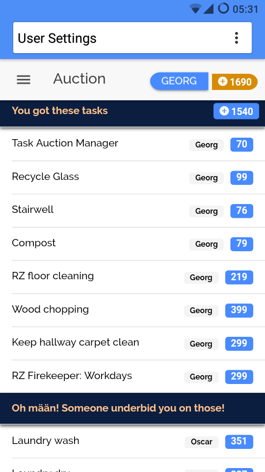 Each Monday, a reverse auction for chores begins. The resident who bids the least amount of points for a chore wins the chore, and must complete it before the following Monday in order to be awarded the points.