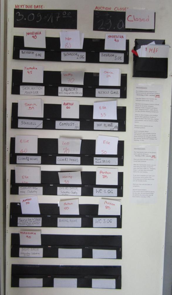 The task auction may be conducted on a panel in a public area, using paper pockets and slips of paper.